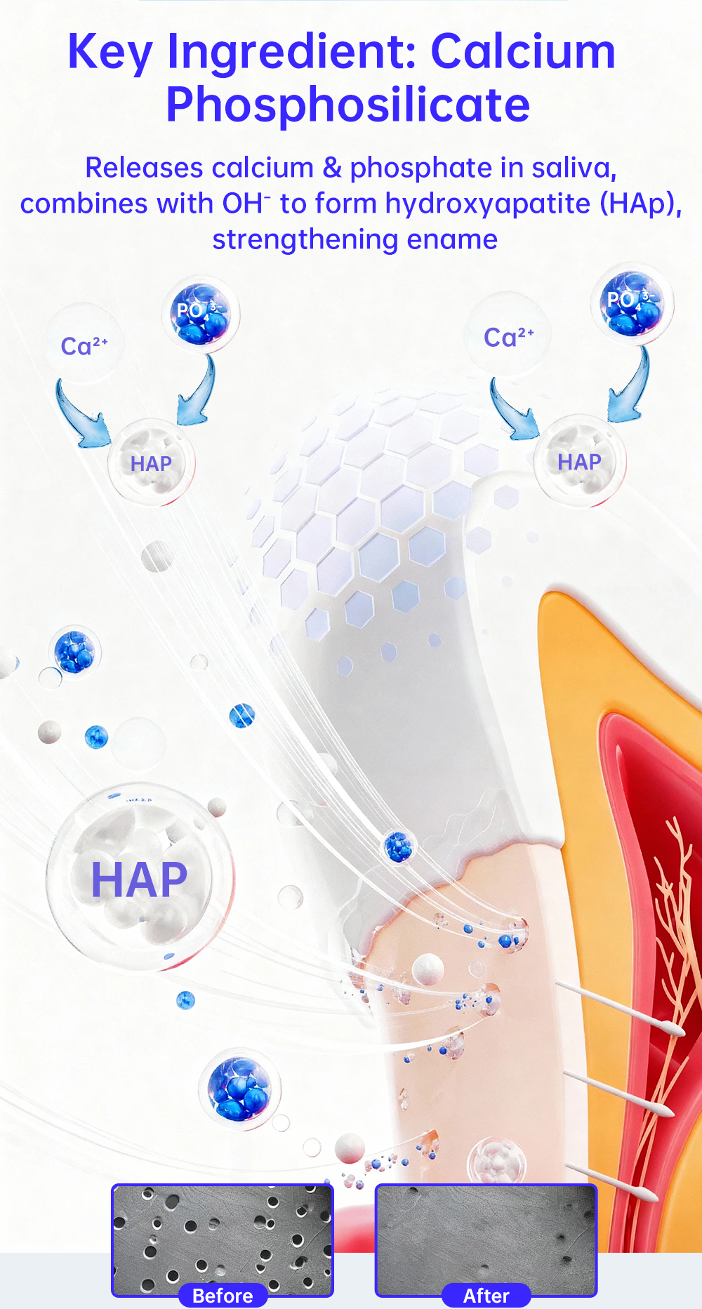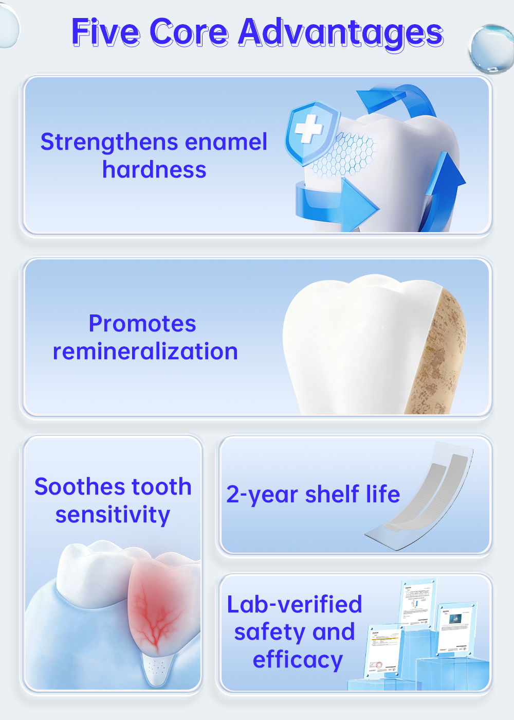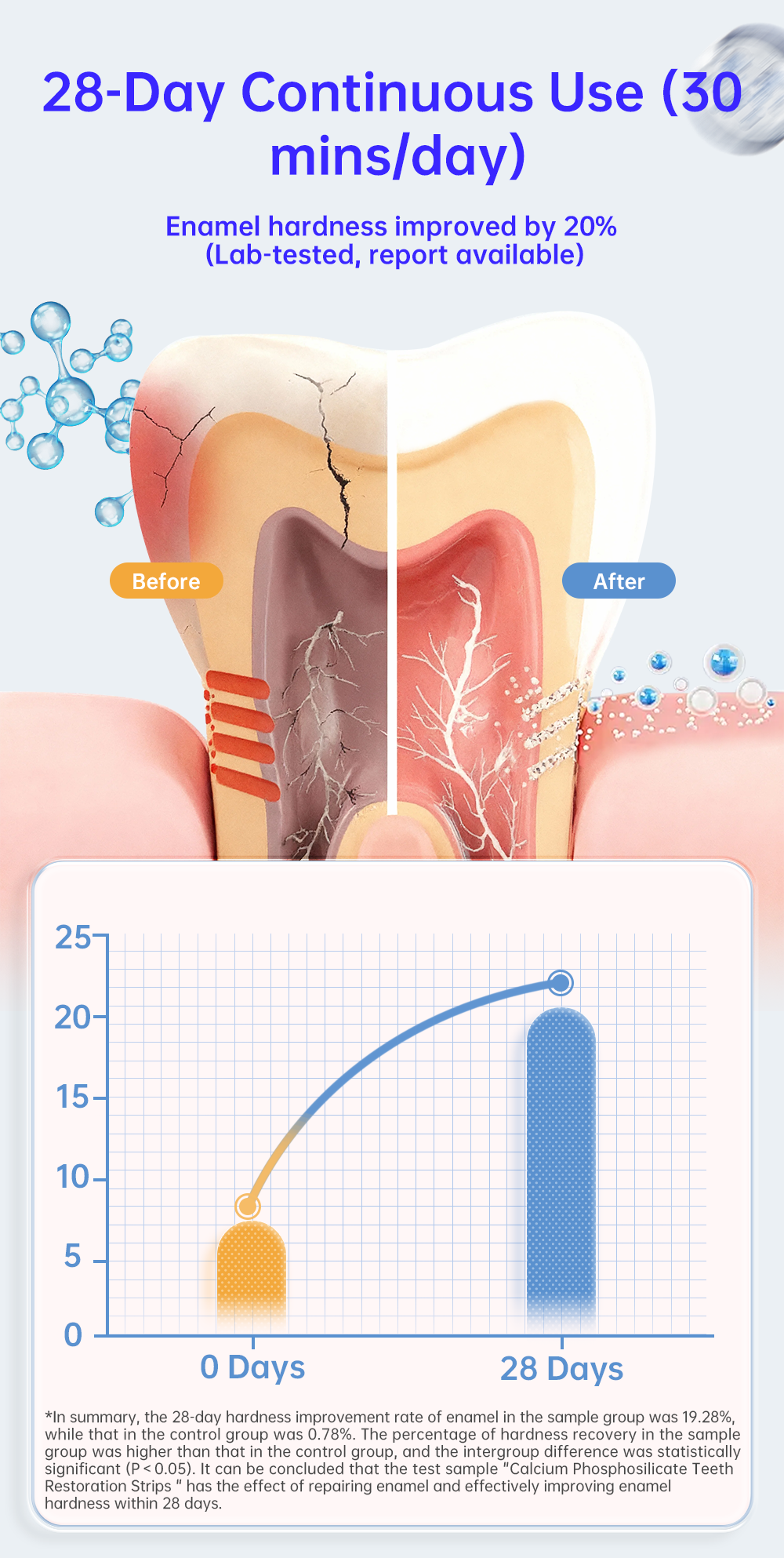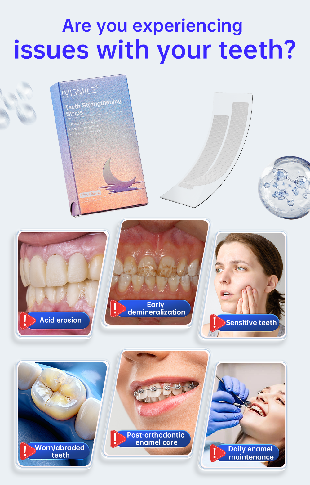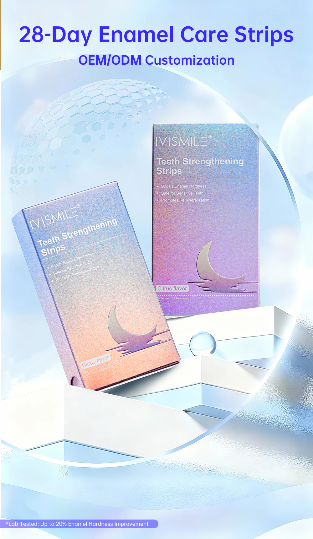 IVISMILE Teeth Strengthening Strips are designed for enamel care: formulated with calcium phosphosilicate, they release ions to form hydroxyapatite—boosting enamel hardness, promoting remineralization, and safe for sensitive teeth. Citrus-flavored, 28-treatment kit with individual easy-to-use packets. Ideal for acid-eroded teeth, post-orthodontic care, and daily enamel maintenance. Lab-verified efficacy.