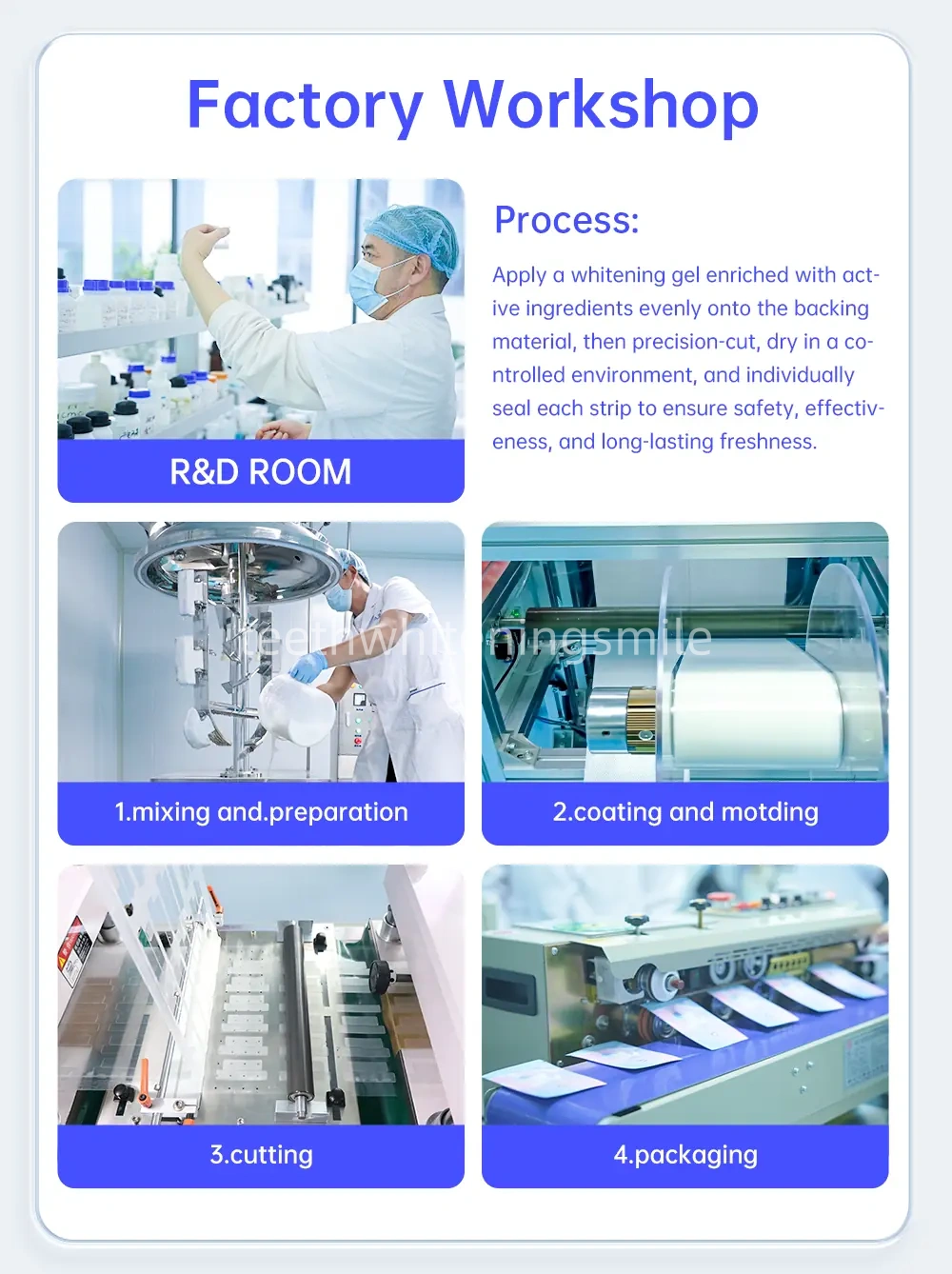 IVISMILE: With over 6 years of experience in the Oral Care industry and a factory area spanning more than 20,000 square meters, we have established popularity in regions including the US, UK, EU, Australia, and Asia. Our robust R&D capabilities are complemented by certifications such as CE, ROHS, CPSR, and BPA FREE. Operating within a 100,000-level dust-free production workshop ensures the highest quality standards for our products.