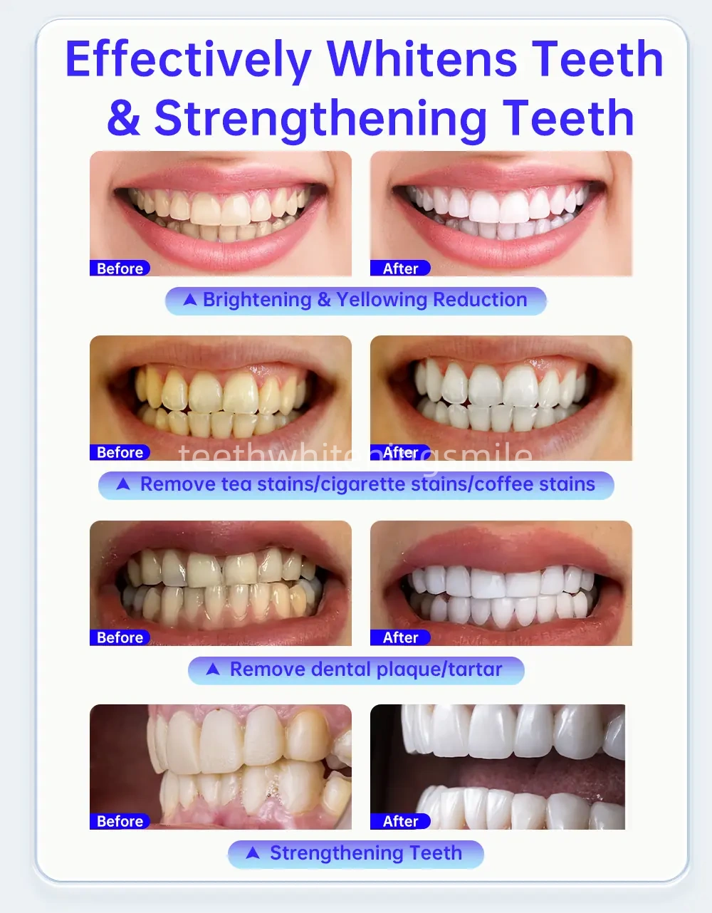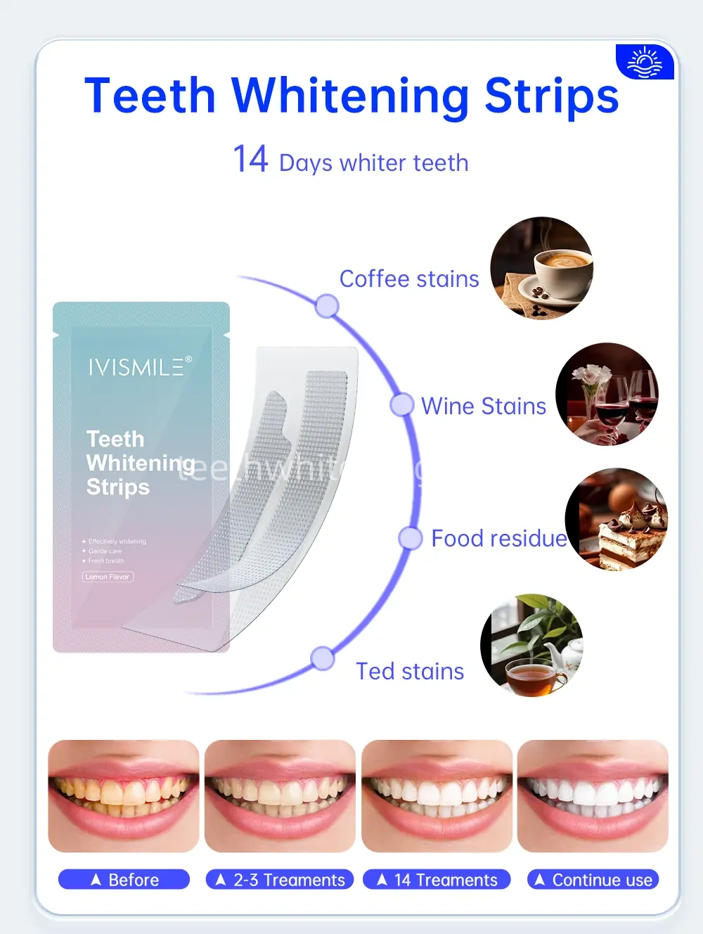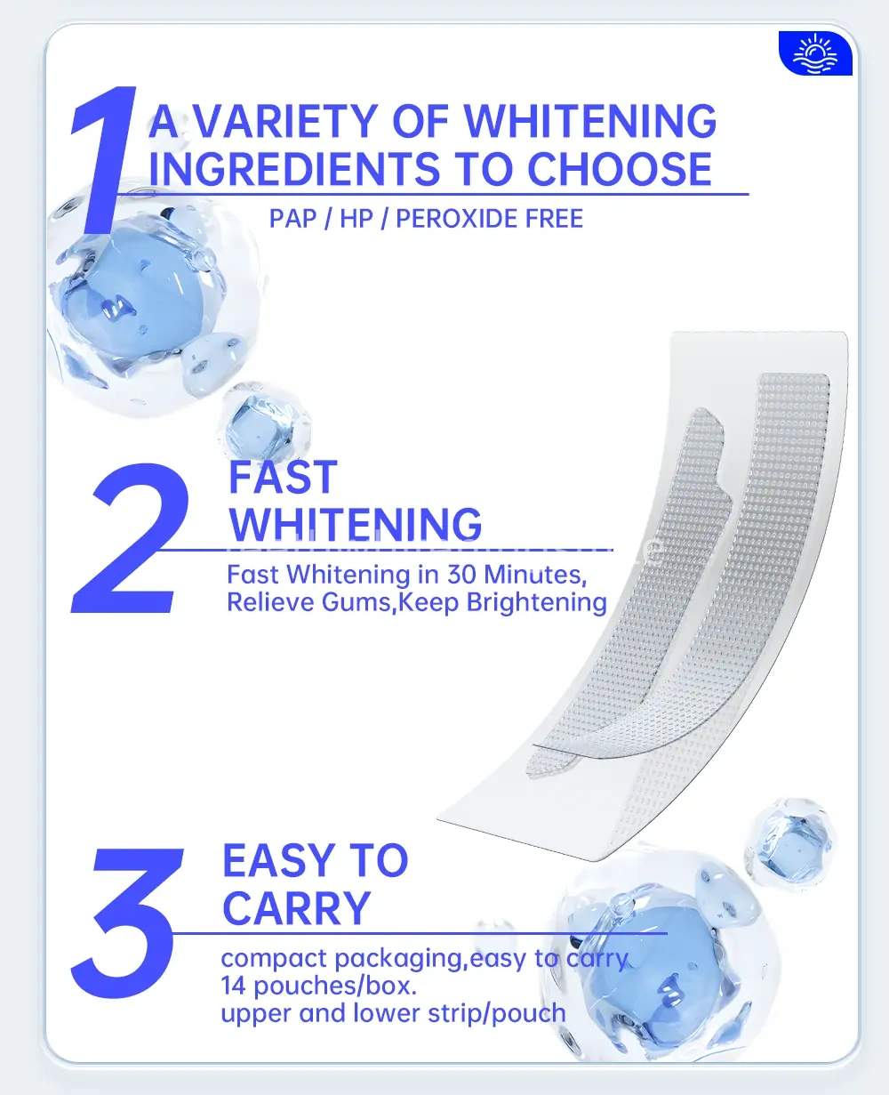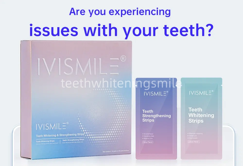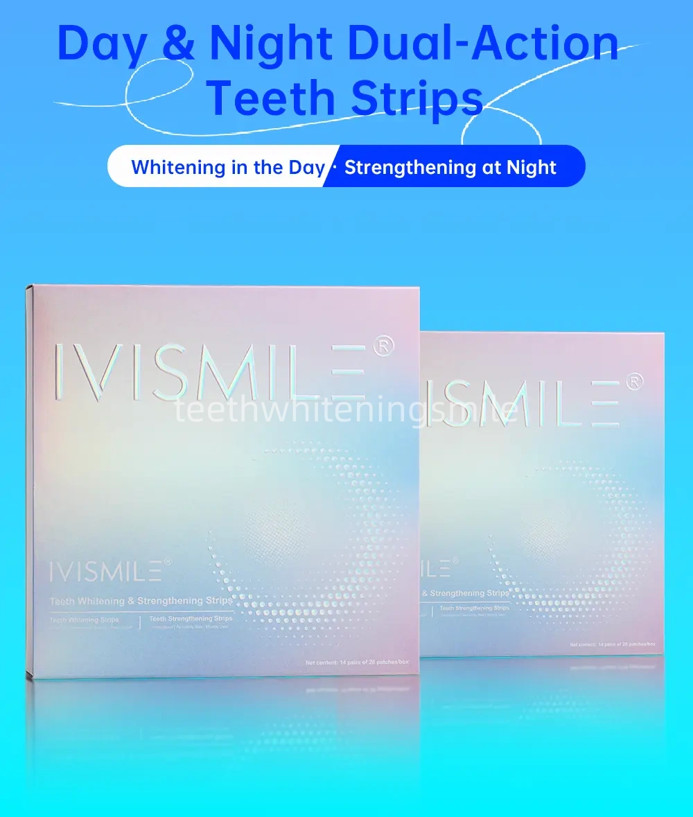Elevate your smile with IVISMILE Day & Night Dual-Action Teeth Strips: a 24-hour solution that brightens by day and strengthens by night. The daytime strips tackle coffee/wine stains in 30 minutes, whitening teeth by 6 shades in 14 days, while nighttime strips rebuild enamel with hydroxyapatite (HAp) to boost hardness by 20% in 28 days—targeting yellowing, sensitivity, acid erosion, and more. With 4 simple steps, enamel-friendly formulas, global certifications (CPNP, SGS, FDA), and customizable private-label options, these portable, individually packaged strips deliver visible, long-lasting results for a confident, healthy smile.