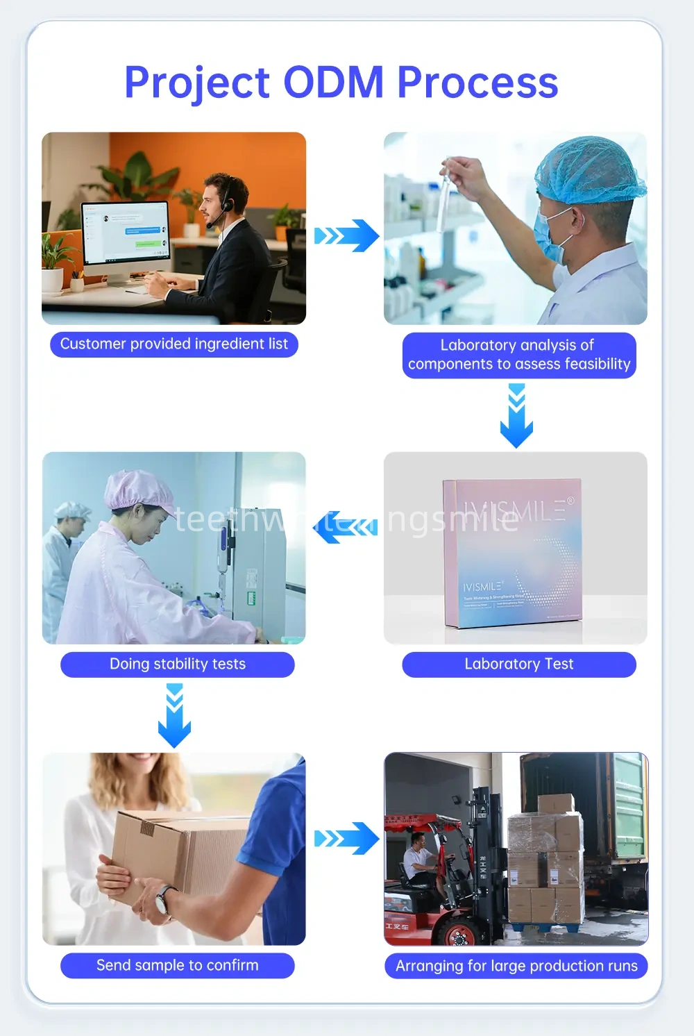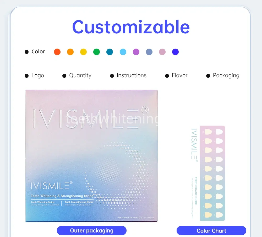 IVISMILE: We specialize in customizing all teeth whitening and cosmetic packaging products to suit your preferences, supported by our skilled design team. OEM and ODM orders are warmly welcomed.