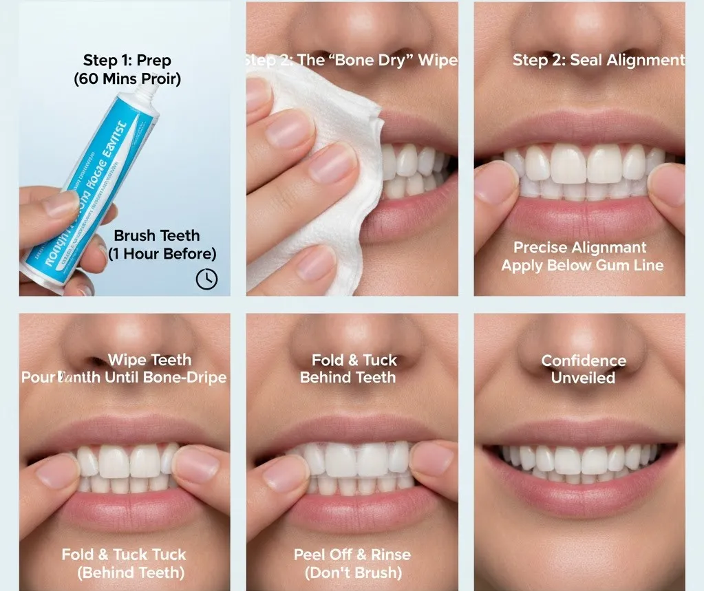 To get the brightest smile possible, you need to stop “slapping them on” and start using the Dry, Align, and Tuck method. Here is the definitive guide to doing it right.