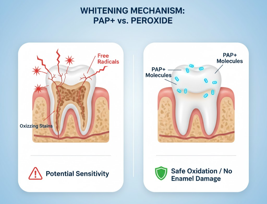 For dental brands and distributors, the choice between PAP+ and Peroxide comes down to your target market’s regulations and consumer pain points. Peroxide remains the gold standard for clinical-grade speed, while PAP+ is the superior choice for non-sensitive, regulation-friendly, and enamel-safe home whitening.